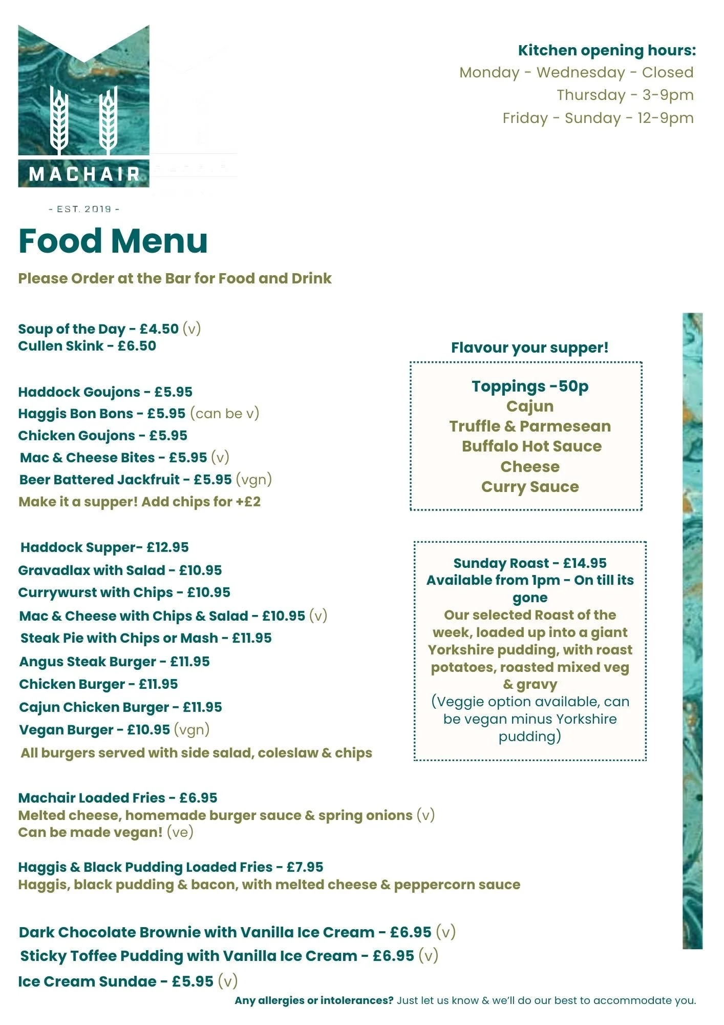 The MachairFood Menu Available Thursday to Sunday Book Now Looking for a booking with a group of 10 or more? Consider our buffet options! Kitchen HoursMonday - Wednesday - ClosedThursday 3pm - 9pm Friday - Sunday 12pm - 9pm